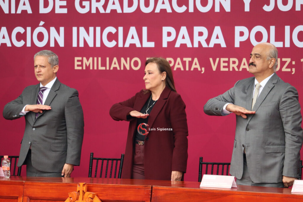Durante la Ceremonia de Graduación y Jura de Bandera de la Generación XL de Policías de Proximidad, la Gobernadora destacó “hoy refrendamos el pacto entre el Estado y la sociedad para construir juntos un Veracruz más seguro”, y añadió que este acto simboliza el compromiso, la disciplina y la vocación de servicio.