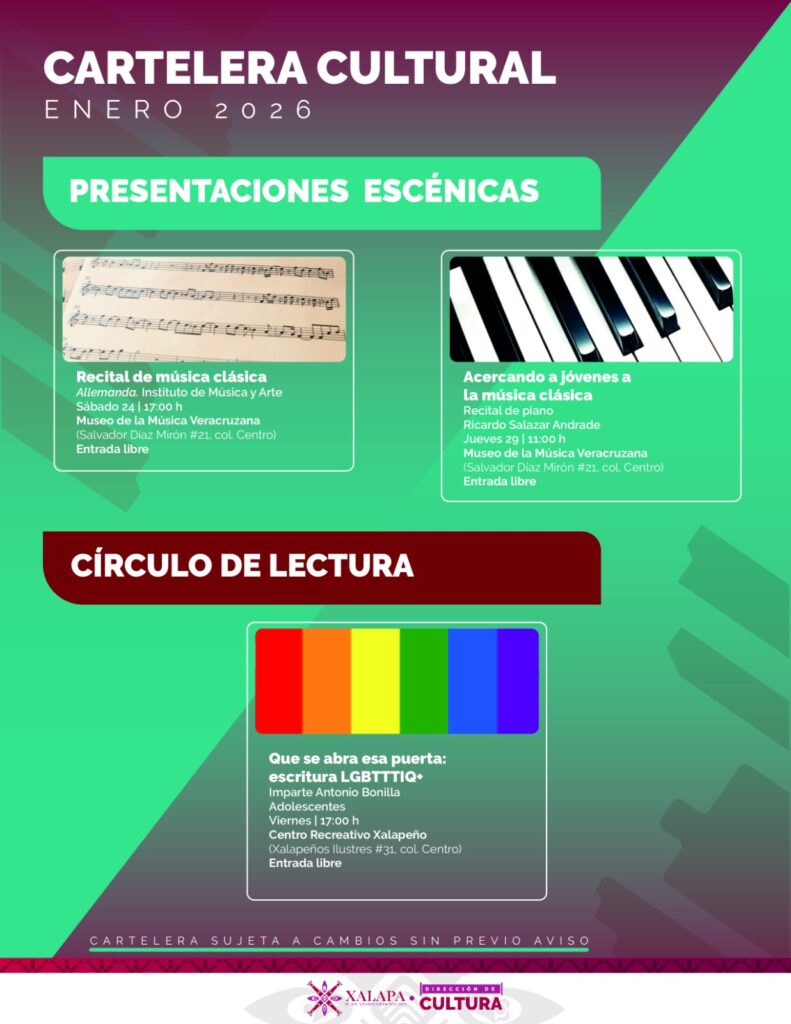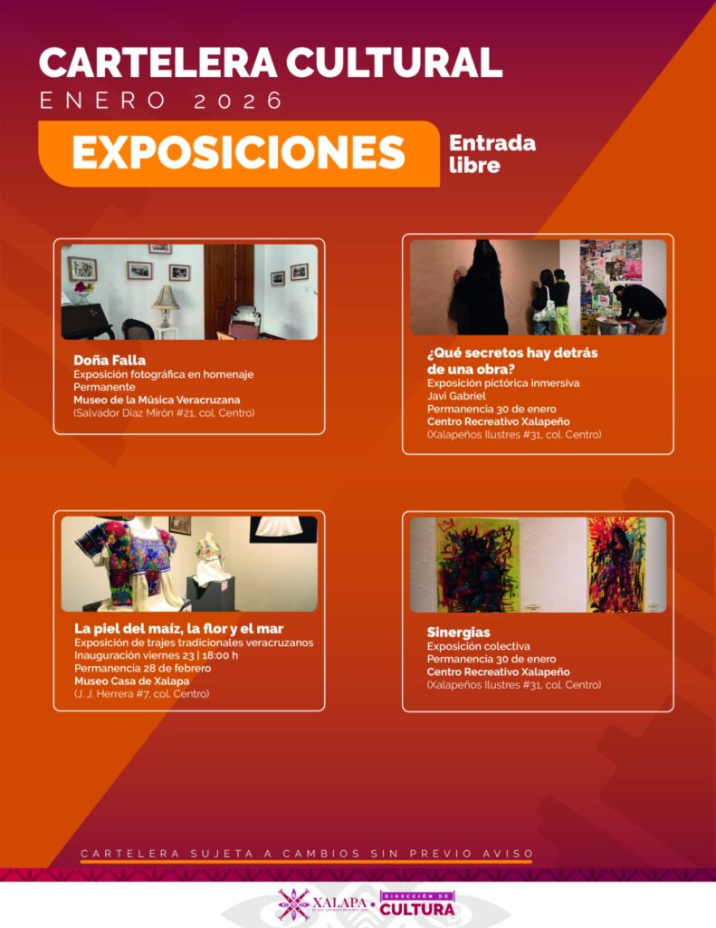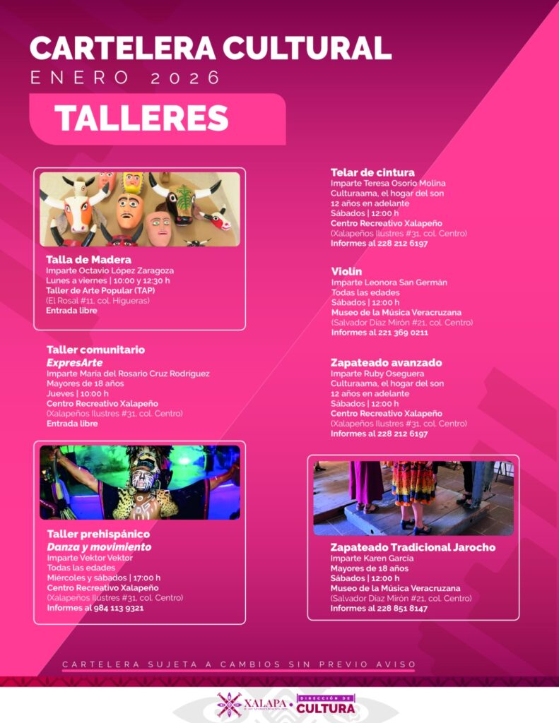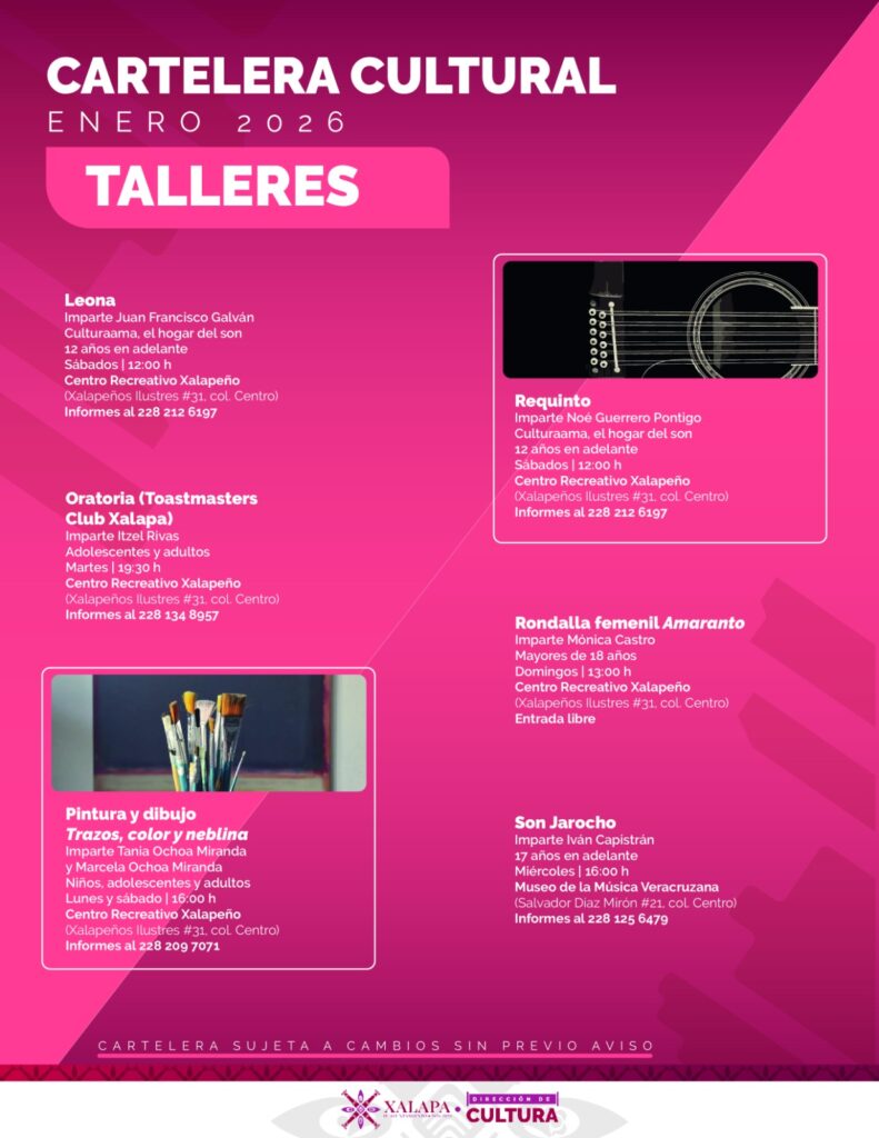 Xalapa, Ver., 16 de enero de 2026.– El Ayuntamiento de Xalapa dio a conocer su agenda cultural con una amplia variedad de talleres, proyecciones cinematográficas, exposiciones, música y actividades recreativas, dirigidas a niñas, niños, jóvenes y adultos, que se desarrollarán en diversos espacios culturales de la ciudad.