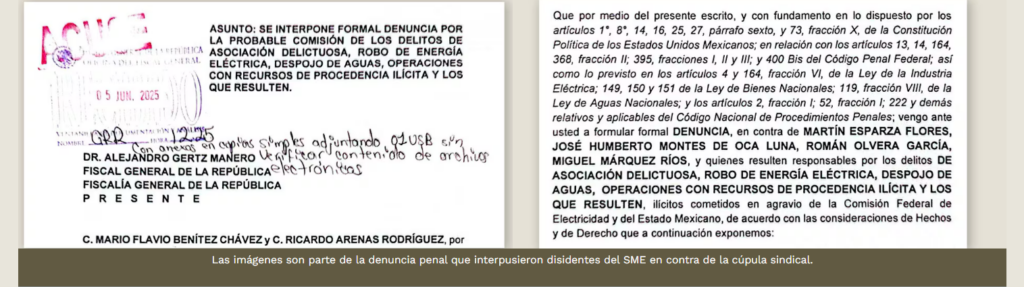 En el documento que entregaron a la FGR acusaron directamente a Martín Esparza, secretario general del SME; Humberto Montes de Oca, secretario del Exterior; Román Olvera García, subsecretario de la División Necaxa; y Miguel Márquez Ríos, secretario del Fomento a la Salud, además de diputado en Puebla del Partido Verde. Les achacaron los delitos de “asociación delictuosa, robo de energía eléctrica, despojo de aguas, operaciones con recursos de procedencia ilícita y los que resulten, cometidos en agravio de la Comisión Federal de Electricidad (CFE) y del Estado Mexicano”.
